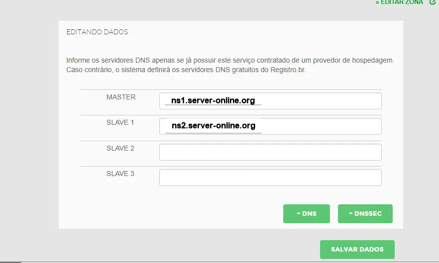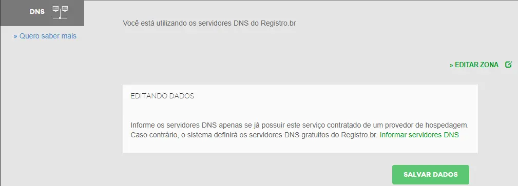Insira então os dados de dns que constam em seu e-mail de boas vindas e clique em SALVAR DADOS: