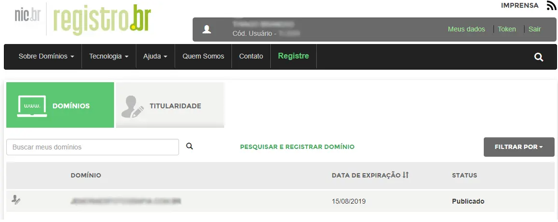 Para alterar o DNS de um domínio nacional acesse sua conta no registro.br e no painel de controle selecione o domínio que será modificado: