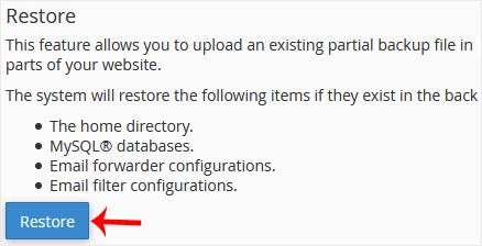 Você pode restaurar facilmente um backup parcial do cPanel. Observe que a restauração desse backup substituirá os dados existentes.