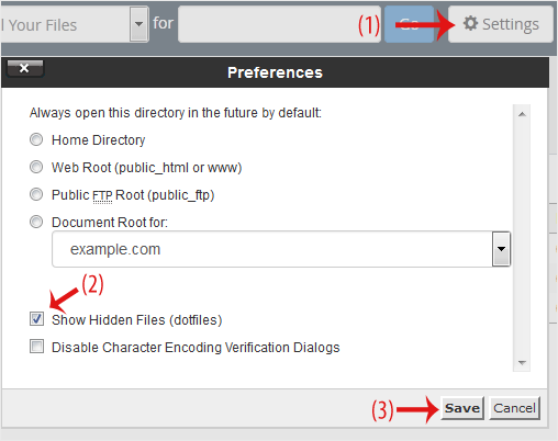 3. Navegue até o diretório onde seu arquivo dot htaccess está localizado. Para editar o arquivo .htaccess de seu diretório raiz, navegue até o diretório public_html. 4. Se o arquivo dot htaccess não aparecer, clique em Configurações no Gerenciador de Arquivos. Você pode encontrar o botão Configurações no lado direito do menu superior. Marque a opção Mostrar arquivos ocultos (Dotfiles) na caixa da nova janela e clique em Salvar . Agora, o arquivo dot htaccess deve estar presente. Se não existir, crie um novo. 5. Clique com o botão direito do mouse no arquivo dot htaccess e depois em Editar
