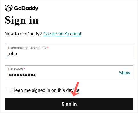 1. Visite Godaddy.com e clique em Sign In . Em "Usuários registrados", clique novamente em Login . Você será redirecionado para o formulário de login.