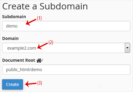 3. No campo Subdomínio , insira o nome do seu subdomínio, como demo . Selecione o domínio apropriado na lista suspensa se você tiver vários domínios.