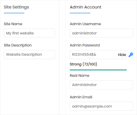 - Nome de usuário do administrador: Seu novo nome de usuário do Drupal (por motivos de segurança, não use o administrador ou o nome de usuário admin).