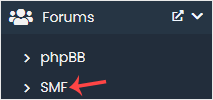 4. No lado esquerdo, localize a categoria Fóruns . Clique nele e depois no link SMF que aparece. 5. Clique em Instalar . 6. Preencha os campos necessários nos campos de configuração de software :