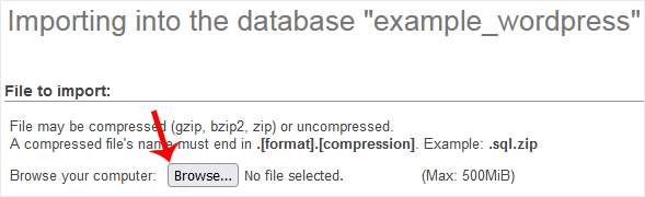 5. Em Arquivo para Importar , clique em Procurar e selecione o arquivo SQL do seu computador.