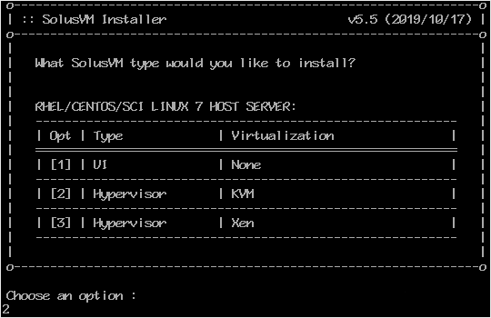 Etapa 2: para o CentOS 7, ele mostrará a opção de escolher a virtualização. A maioria das pessoas prefere KVM ou Xen. Selecione sua virtualização preferida digitando 2 ou 3 e pressione Enter. Para KVM, digitamos 2 e então pressionamos Enter.