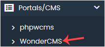 4. No lado esquerdo, localize a categoria Portal/CMS . Clique nele e depois no link WonderCMS que aparece. 5. Clique em Instalar . 6. Preencha os campos necessários nos campos de configuração de software :